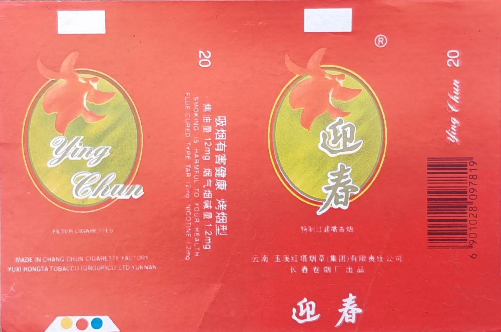 迎春花是落叶灌木丛生的木本植物,有“金腰带““清明花”和“小黄花”等别称,与山茶花、梅花、水仙一起被称为“雪中四友”。上世纪90年代,长春卷烟厂出品过“迎春”卷烟,其烟标正副版图案相同,设计简洁明快,以大红色为底色,绘有绽放的迎春花,主版以行书体书“迎春”二字,副版则为“yingchun”拼音。