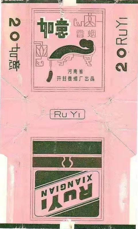 “如意”烟标是河南开封卷烟厂早期出品,采用粉绿色搭配,主版图案为一柄如意,副版为汉语拼音“RuYi”。